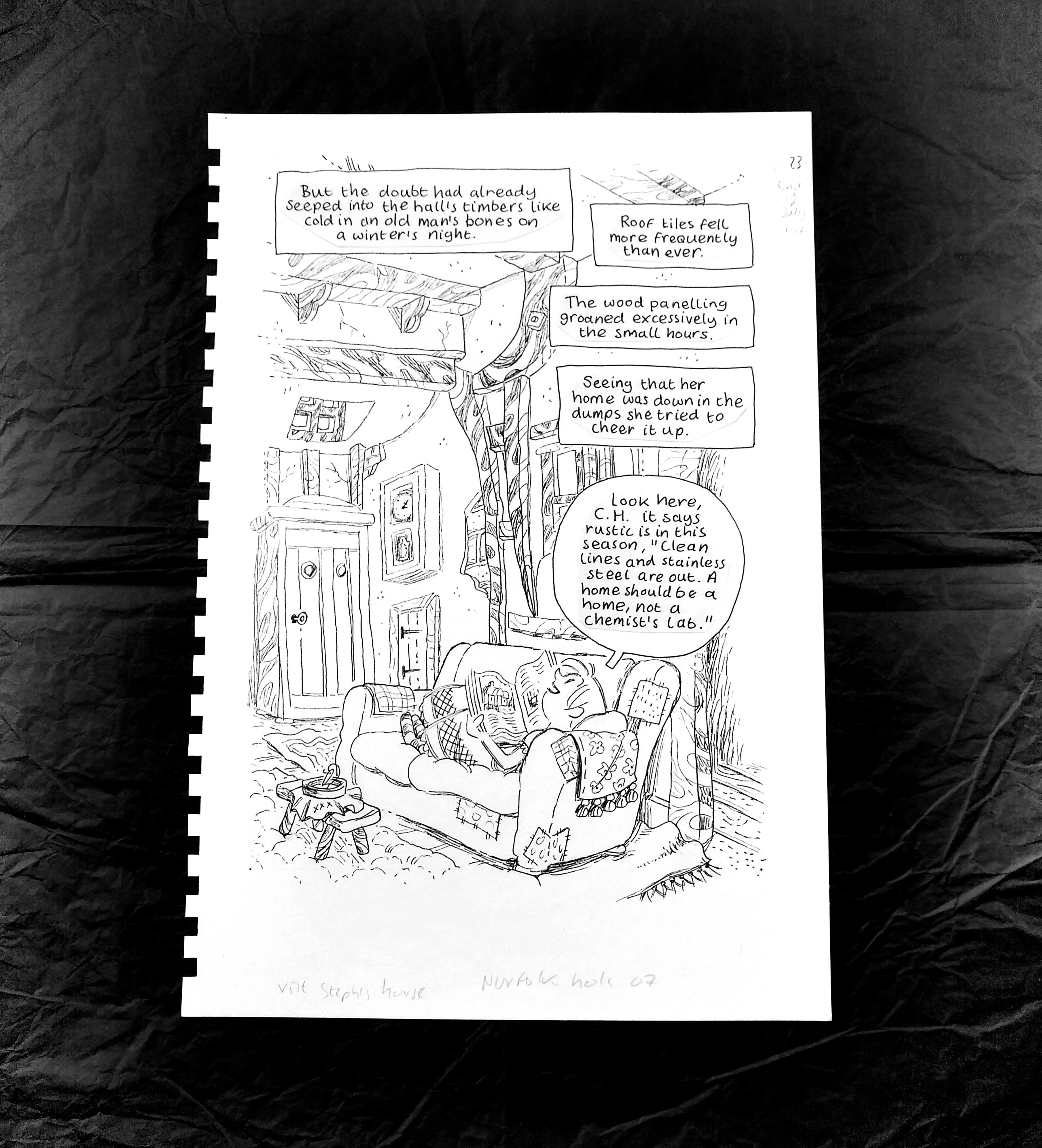 I really like those Glister pages, not just beacuse I was clearly relishing telling those stories, but because they remind me other fun times. The holiday in Norfolk was great. The interior of the cottage with the exposed beams was a pleasure to draw. We enjoyed ourselves. I went swimming countless times after, but I still regret not putting the work aside and jumping into the pool. After I’d changed into my swimming costume, of course. You can take this spontaneity thing too far.